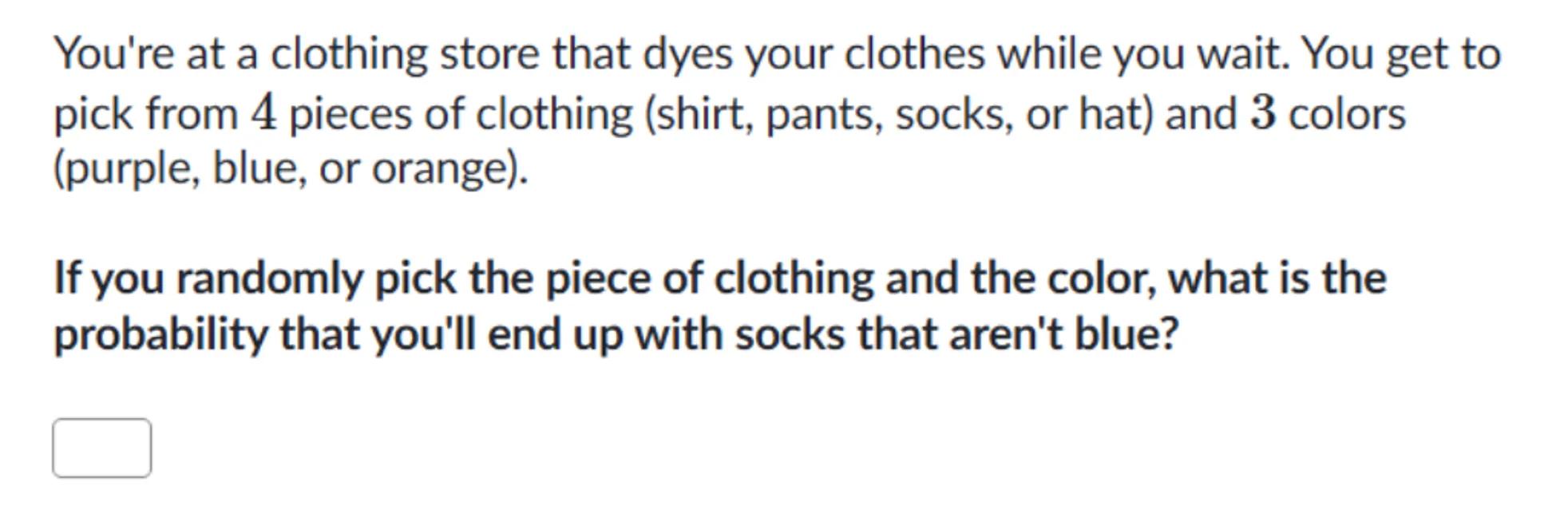 You're at a clothing store that dyes your clothes while you wait. You get to pick from 4 pieces of clothing (shirt, pants, socks, or hat) and 3 colors (purple, blue, or orange).