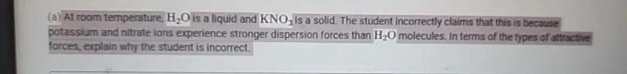 (a) At room temperature, is a liquid and is a solid. The student incorrectly claims that this is because potassium and nitrate ions experience stronger dispersion forces than molecules. In terms of the types of aftractive forces, explain why the student is incorrect.