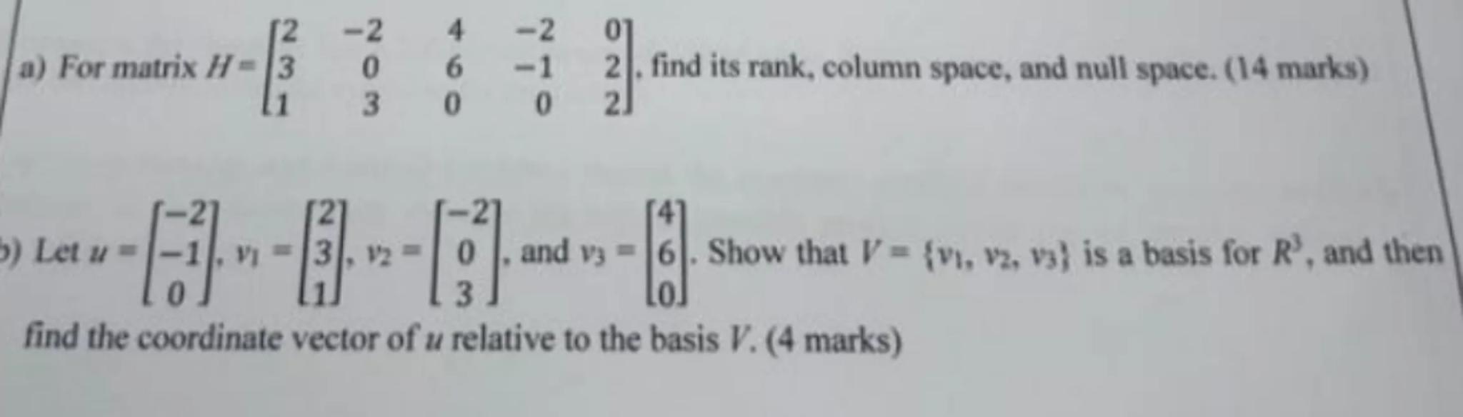a) For matrix , find its rank, column space, and null space. (14 marks)