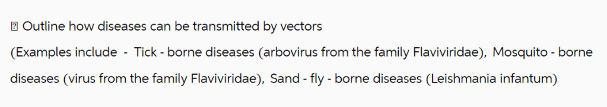 (Examples include - Tick - borne diseases (arbovirus from the family Flaviviridae), Mosquito - borne diseases (virus from the family Flaviviridae), Sand - fly - borne diseases (Leishmania infantum)
