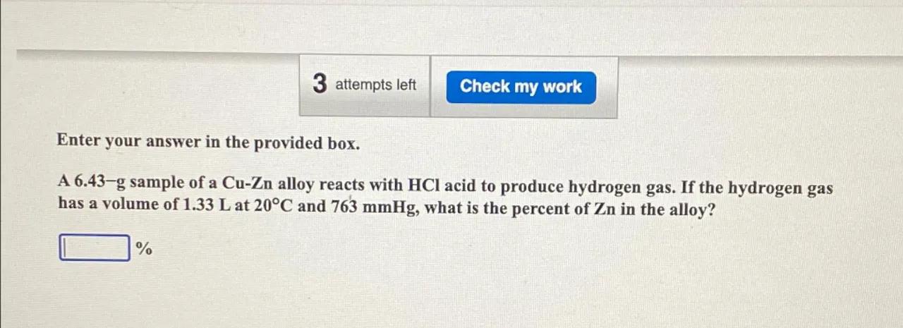 A 6.43-g sample of a alloy reacts with acid to produce hydrogen gas. If the hydrogen gas has a volume of at and , what is the percent of in the alloy?