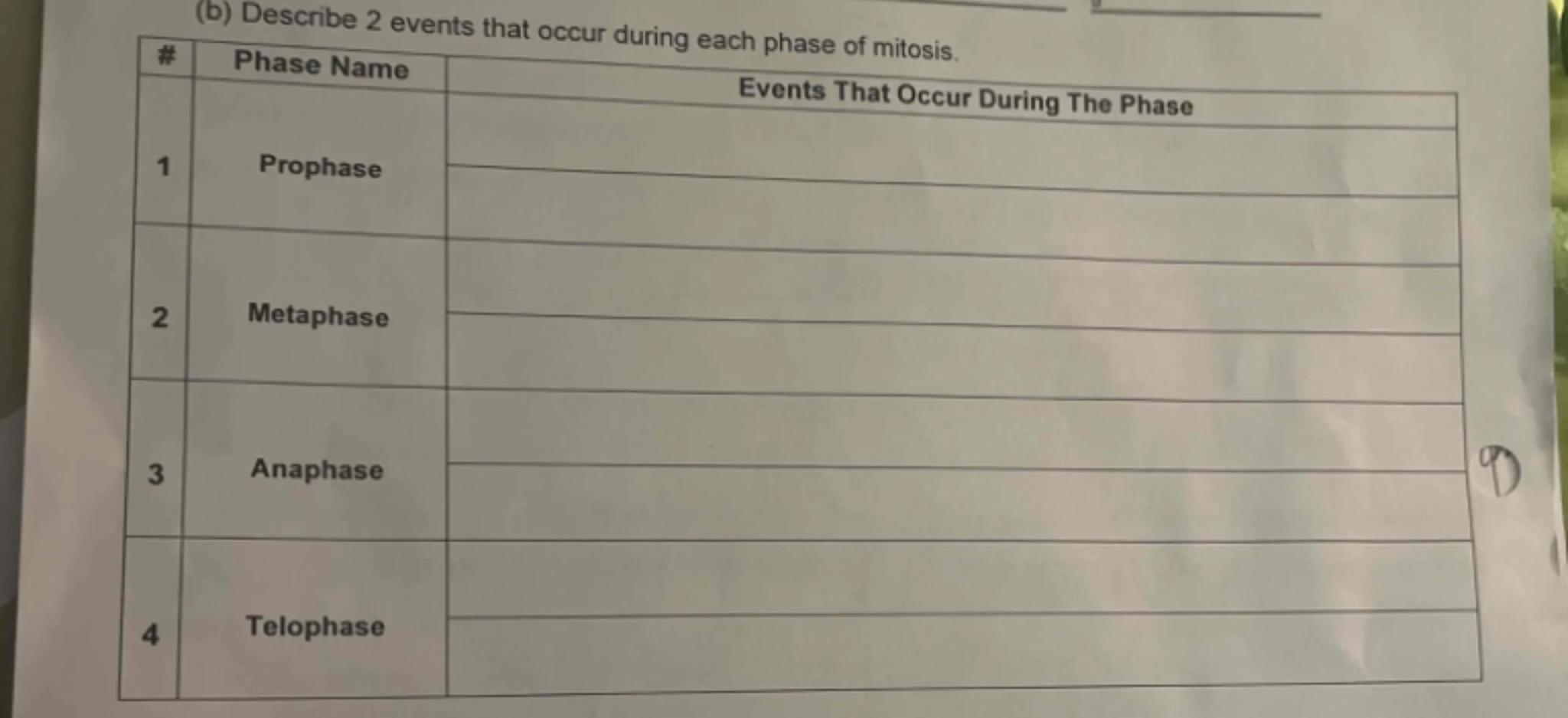 (b) Describe 2 events that occur during each phase of mitosis.