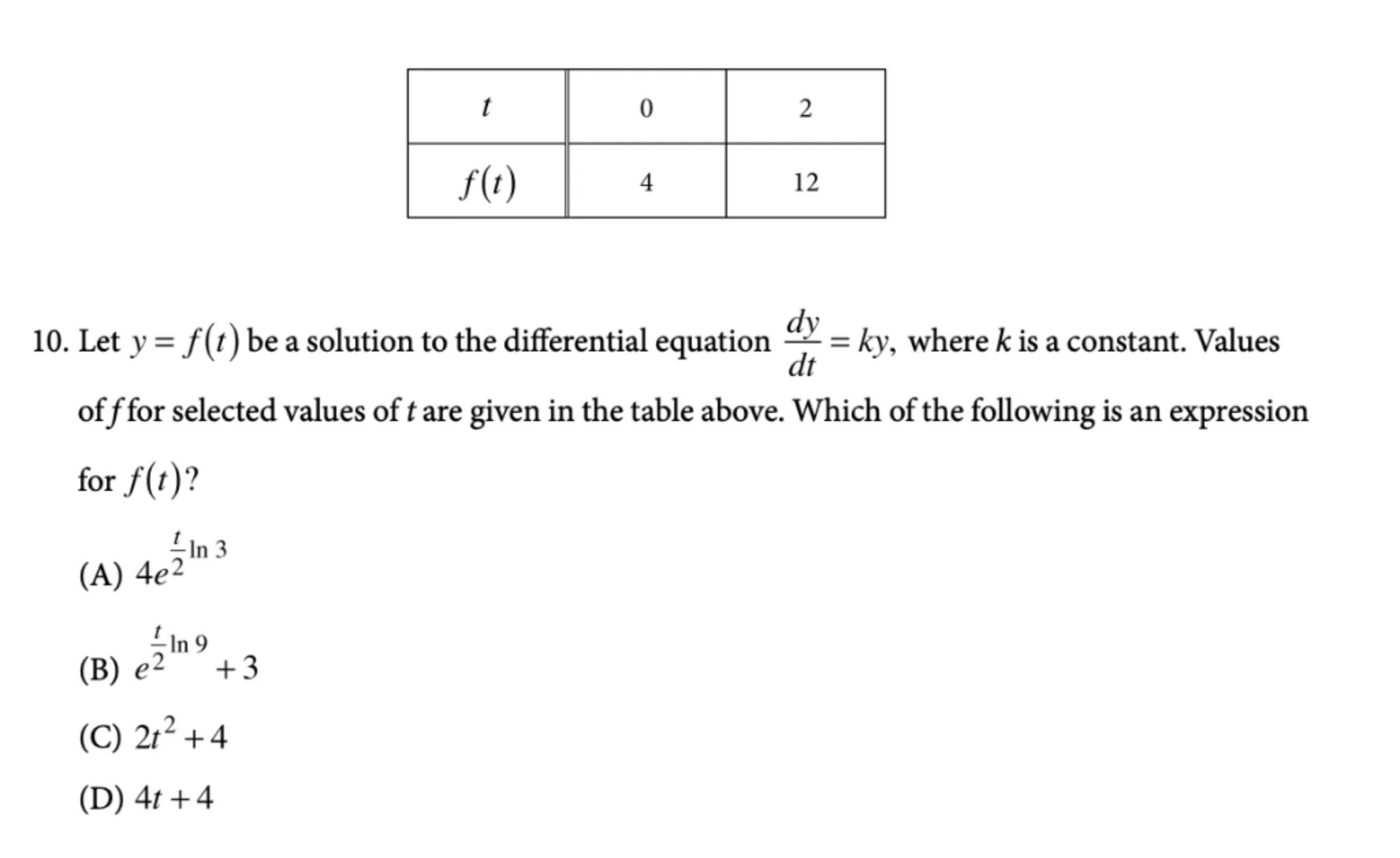10. Let be a solution to the differential equation , where is a constant. Values of for selected values of are given in the table above. Which of the following is an expression for ?