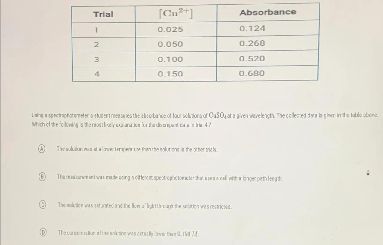 Using a spectrophotometer, a student measures the absorbance of four solutions of at a given wavelength. The collected data is given in the table above. Which of the following is the most likely explanation for the discrepant data in trial 4 ?