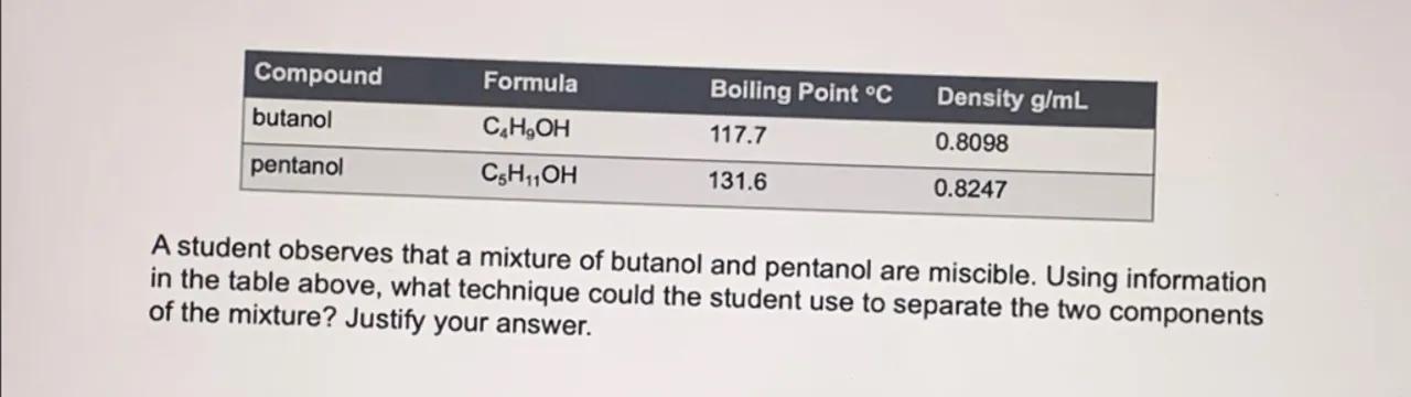 A student observes that a mixture of butanol and pentanol are miscible. Using information in the table above, what technique could the student use to separate the two components of the mixture? Justify your answer.