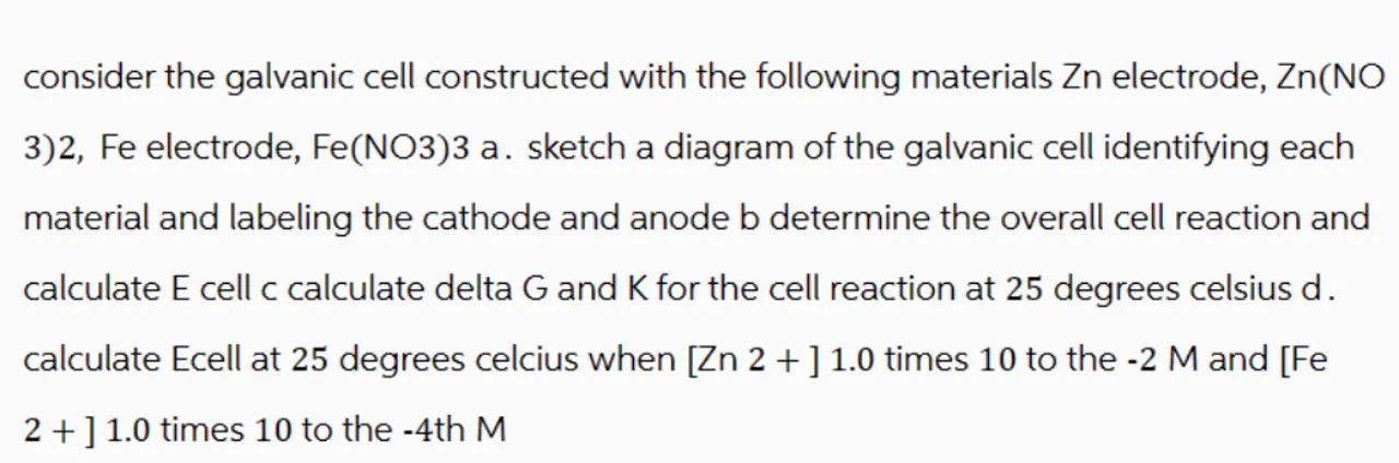 3)2, Fe electrode, . sketch a diagram of the galvanic cell identifying each material and labeling the cathode and anode determine the overall cell reaction and calculate cell c calculate delta and for the cell reaction at 25 degrees celsius . calculate Ecell at 25 degrees celcius when times 10 to the and [Fe ] 1.0 times 10 to the -4 th
