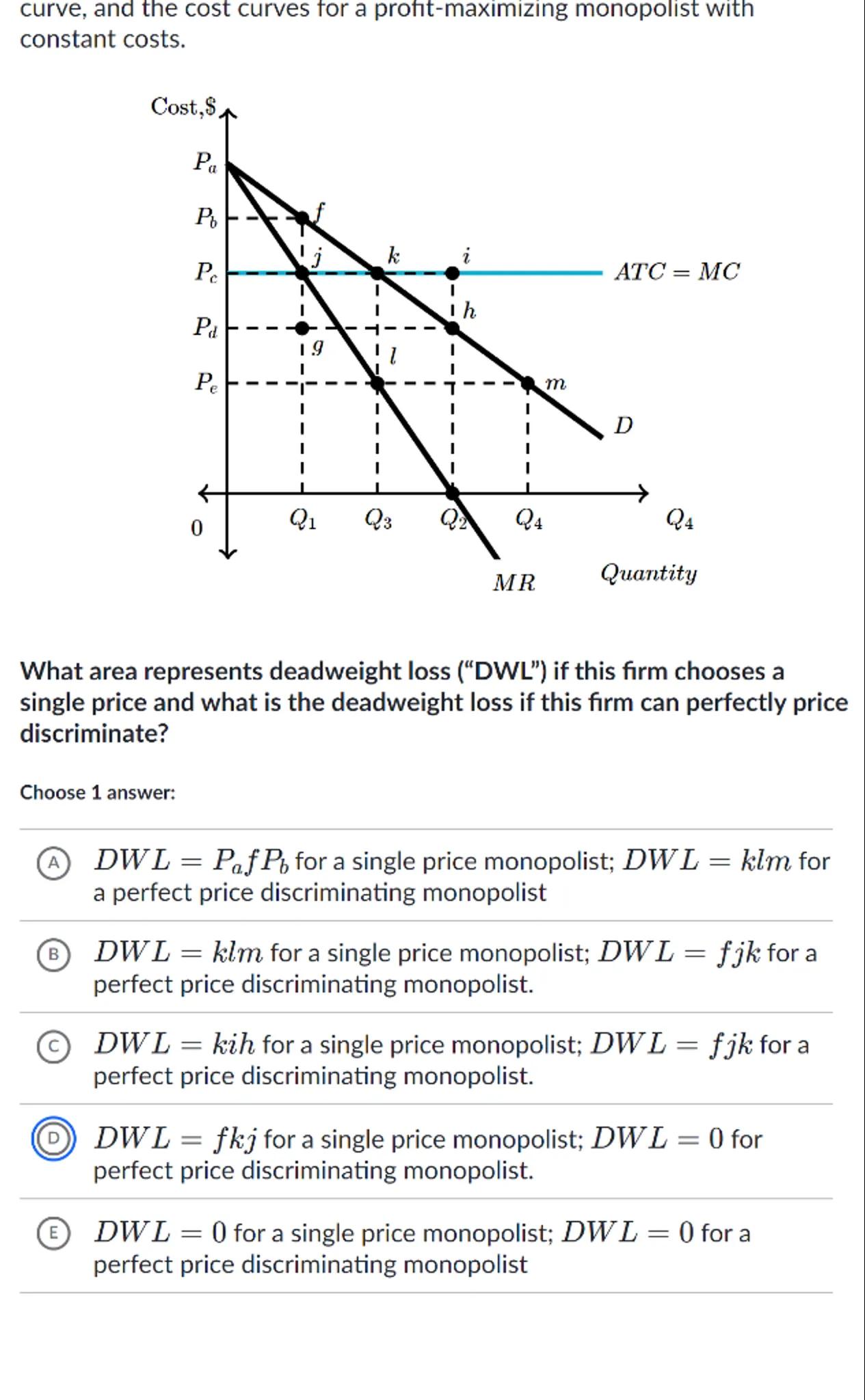 (D) for a single price monopolist; for perfect price discriminating monopolist.