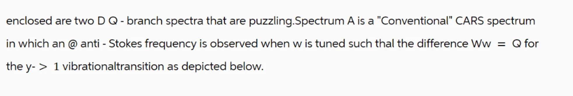 enclosed are two D Q - branch spectra that are puzzling.Spectrum A is a "Conventional" CARS spectrum in which an @ anti - Stokes frequency is observed when w is tuned such thal the difference for the vibrationaltransition as depicted below.