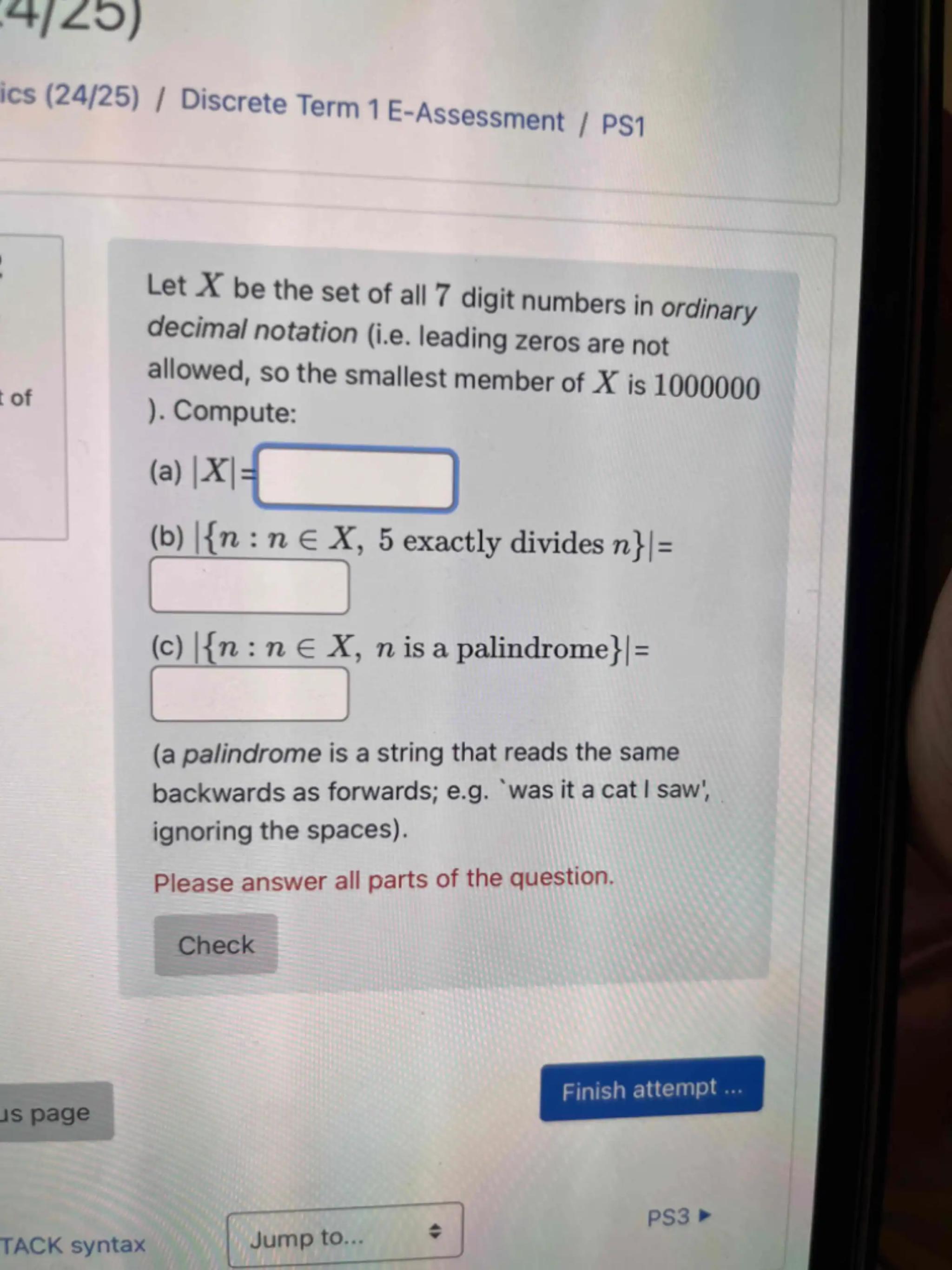 Let be the set of all 7 digit numbers in ordinary decimal notation (i.e. leading zeros are not allowed, so the smallest member of is 1000000 ). Compute:
