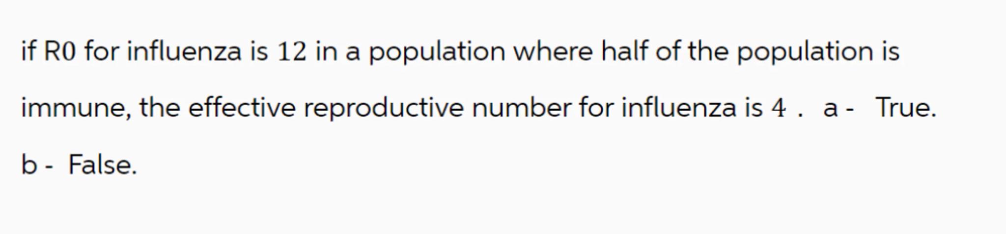 if for influenza is 12 in a population where half of the population is immune, the effective reproductive number for influenza is 4 . a - True.