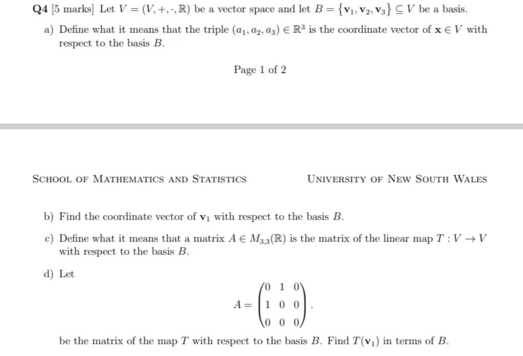 c) Define what it means that a matrix  is the matrix of the linear map  with respect to the basis .
