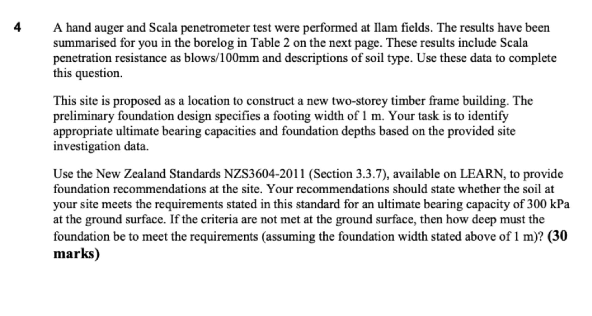 Use the New Zealand Standards NZS3604-2011 (Section 3.3.7), available on LEARN, to provide foundation recommendations at the site. Your recommendations should state whether the soil at your site meets the requirements stated in this standard for an ultimate bearing capacity of at the ground surface. If the criteria are not met at the ground surface, then how deep must the foundation be to meet the requirements (assuming the foundation width stated above of )? (30 marks)