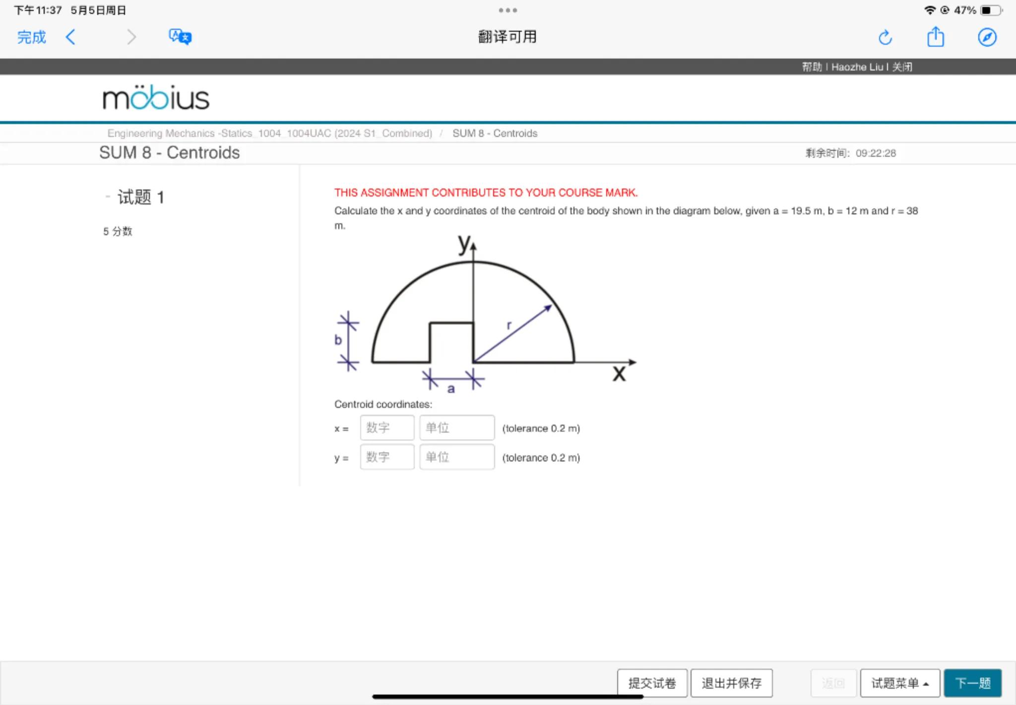 Calculate the and coordinates of the centroid of the body shown in the diagram below, given and m.