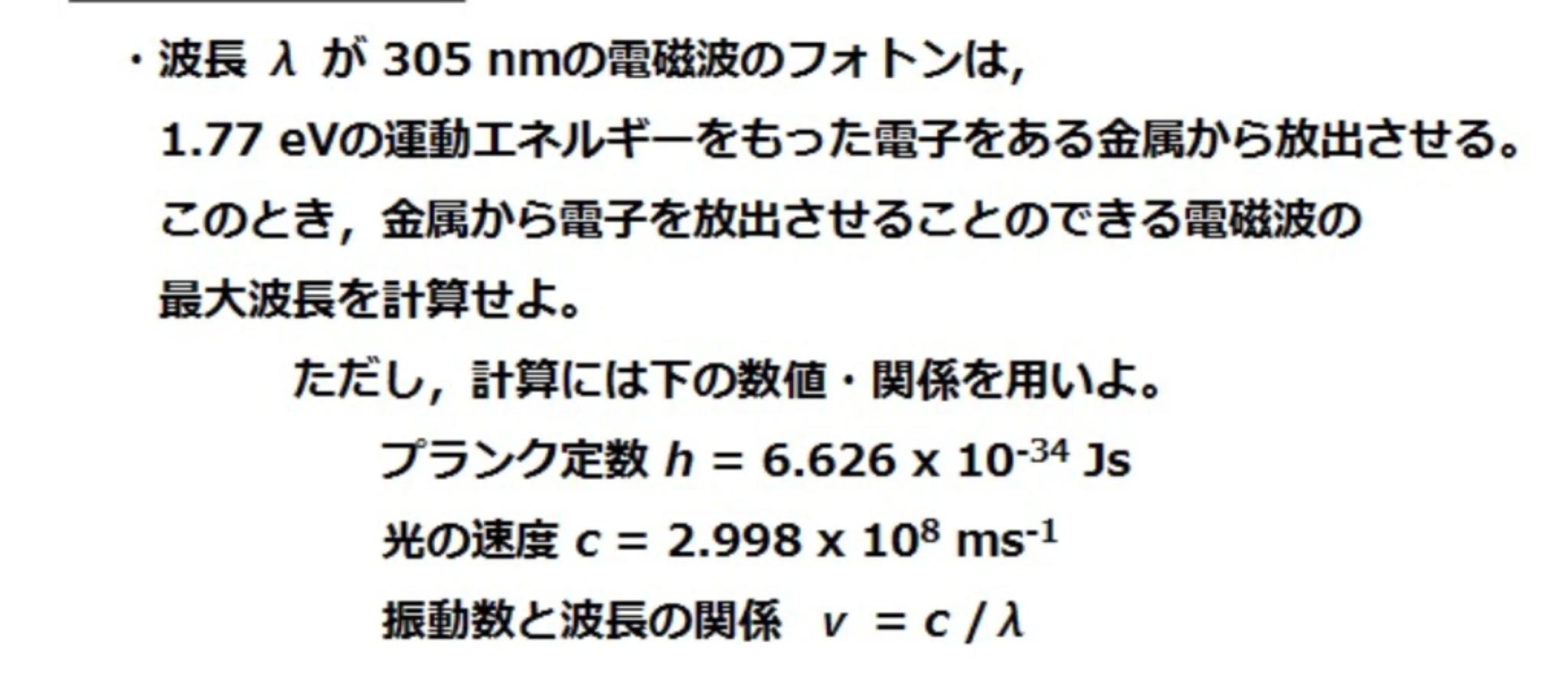1.77 eVの運動エネルギーをもった電子をある金属から放出させる。 このとき,金属から電子を放出させることのできる電磁波の 最大波長を計算せよ。